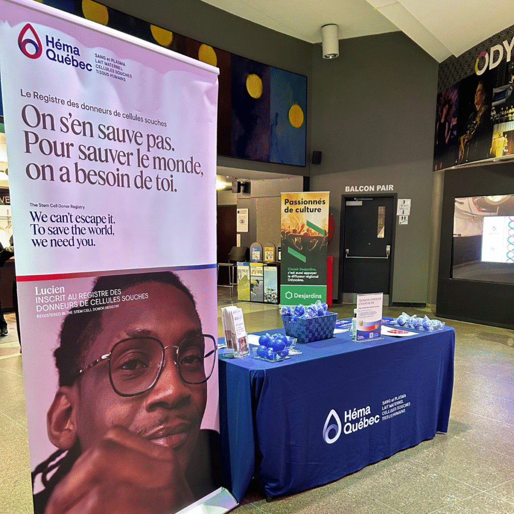 Dans le cadre de son 40e anniversaire et de son axe Redonner, Odyscène a proposé une activité de sensibilisation au don de cellules souches le 9 avril 2026 en collaboration avec Hema-Québec, en amont du spectacle Sciences Po 101 au Théâtre Lionel-Groulx.