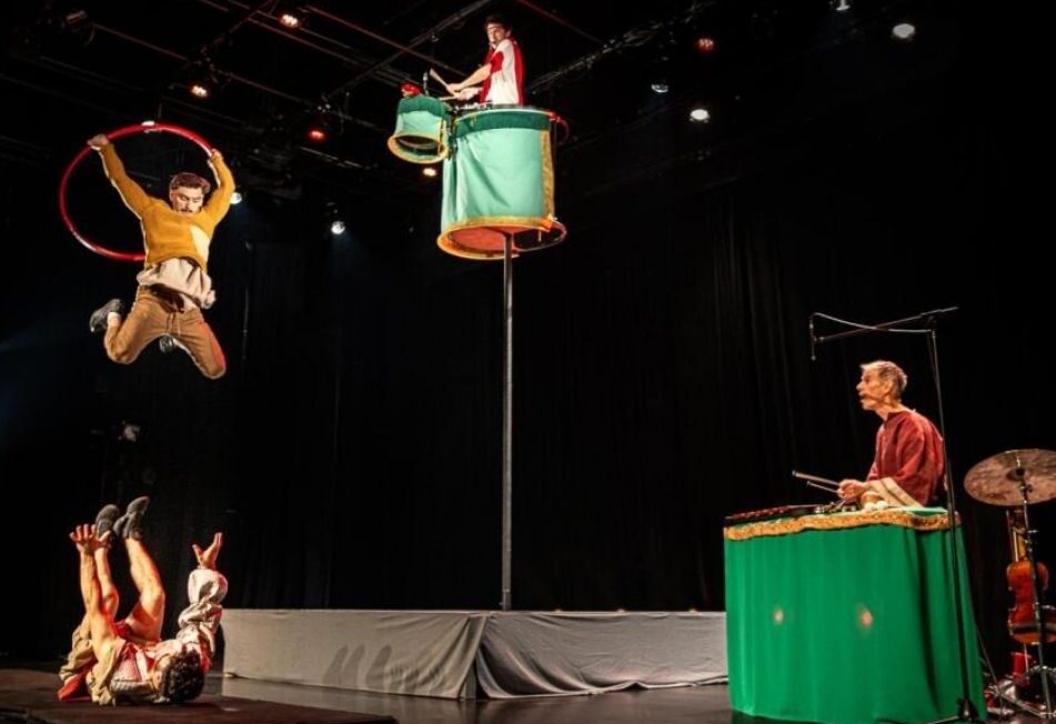 Dans l’arène, deux adversaires aux allures de gladiateurs s’affrontent dans un duel acrobatique ! Perché du haut d’un mât, l’arbitre musicien anime la foule et sollicite son aide pour déterminer le gagnant après les trois rounds du combat.